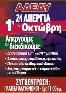 Το Δ.Σ. του Εργατικού Κέντρου Πτολεμαδας αποφάσισε την συμμετοχή του στην 24ωρη Γενική Απεργία της ΓΣΕΕ, την Τετάρτη 1η Οκτωβρίου. ΑΓΩΝΙΖΟΜΑΣΤΕ ΚΑΙ ΔΙΕΚΔΙΚΟΥΜΕ Απόσυρση εδώ και τώρα του απαράδεκτου εργασικού νομοσχεδίου του Υπουργείου Εργασίας. Μείωση του χρόνου εργασίας στις 37,5 ώρες εβδομαδιαίως. Δίκαιο φορολογικό σύστημα. Αύξηση μισθών μέσα από ΣΣΕ και βελτίωση των […]