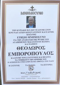 Την Κυριακή 28 Σεπτεμβρίου 2025, στον Ιερό Ναό Αγίων Κωνσταντίνου και Ελένης Κοζάνης, τελείται το ετήσιο μνημόσυνο για την ανάπαυση της ψυχής του Θεοδώρου Εμπορόπουλου. Η οικογένεια καλεί συγγενείς και φίλους να τιμήσουν τη μνήμη του. Η δεξίωση θα πραγματοποιηθεί στην άνω αίθουσα του ναού.